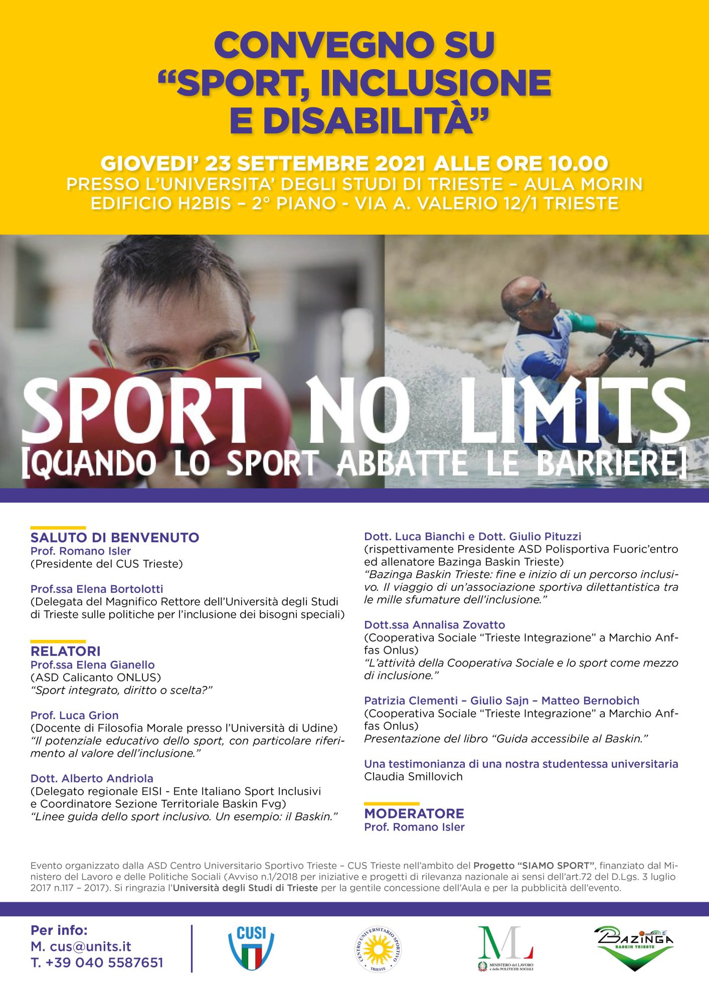 OK Informativa estesa cookieSi terrà giovedì 23 settembre 2021 (ore 10.00), nell’Aula Morin - Edificio H2 Bis al secondo piano di Via A. Valerio 12/1, il convegno su “Sport, Inclusione e Disabilità” organizzato dal Cus Trieste nell’ambito del progetto “Siamo Sport” e denominato SPORT NO LIMITS - QUANDO LO SPORT ABBATTE LE BARRIERE.