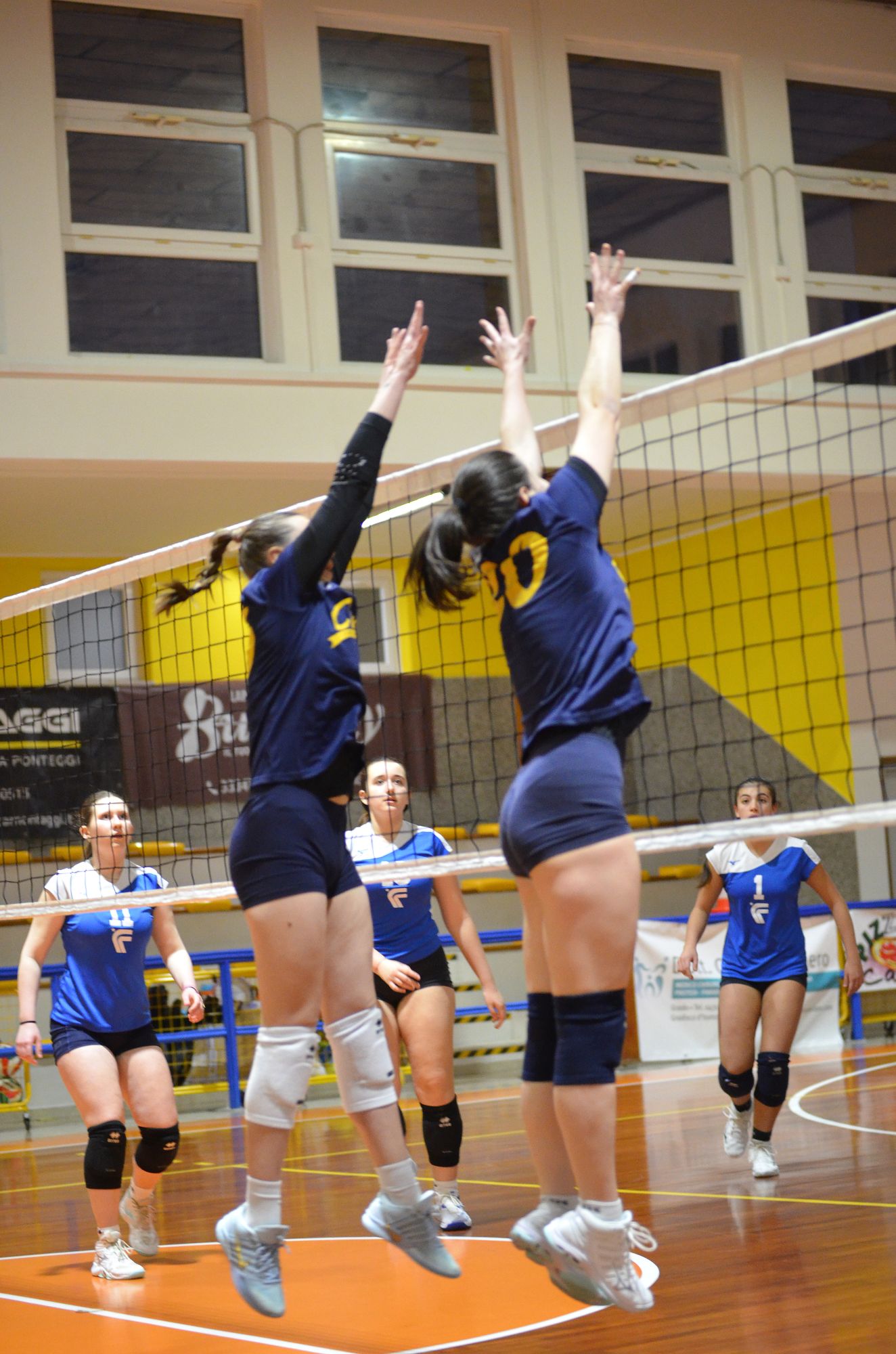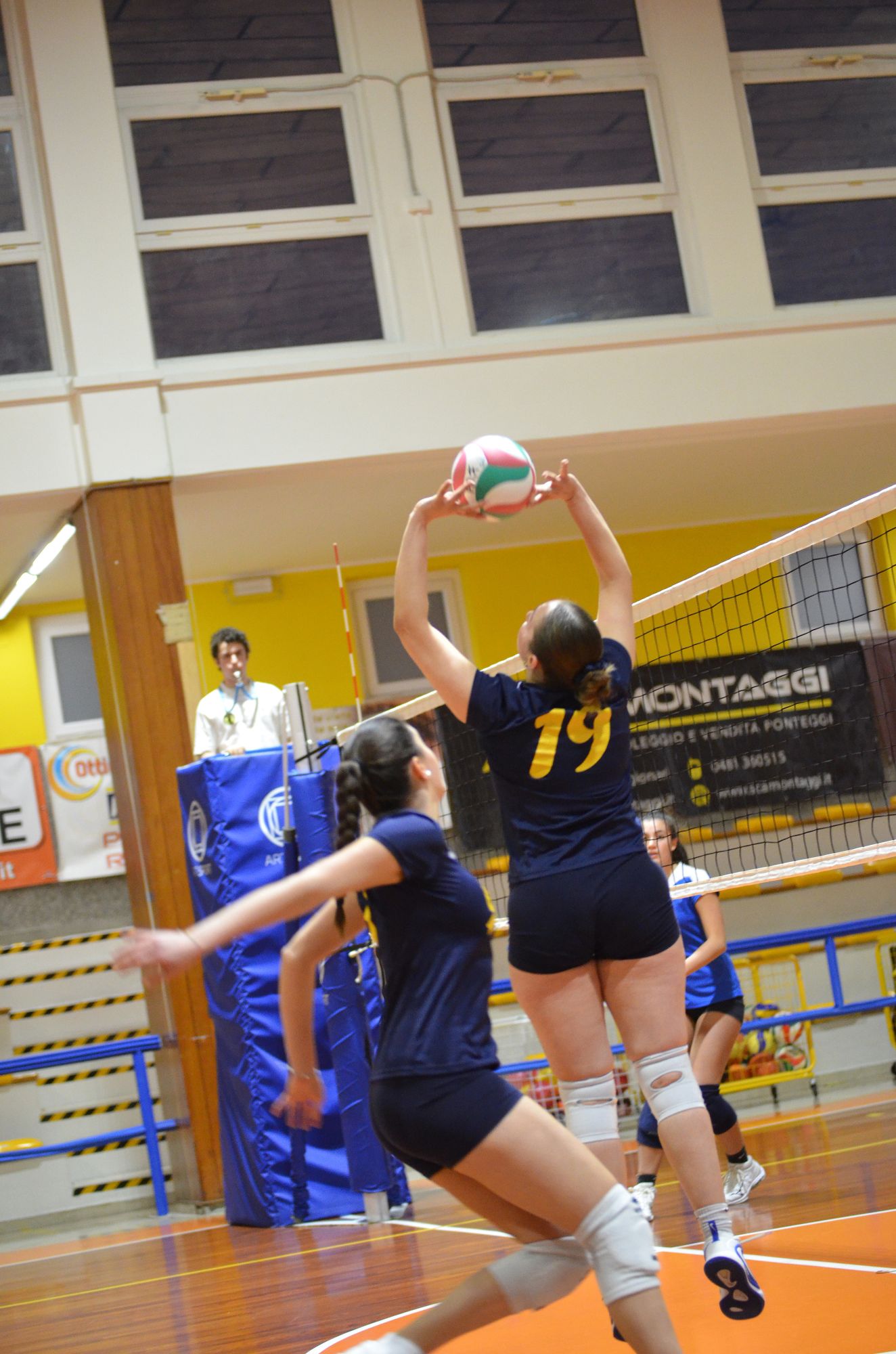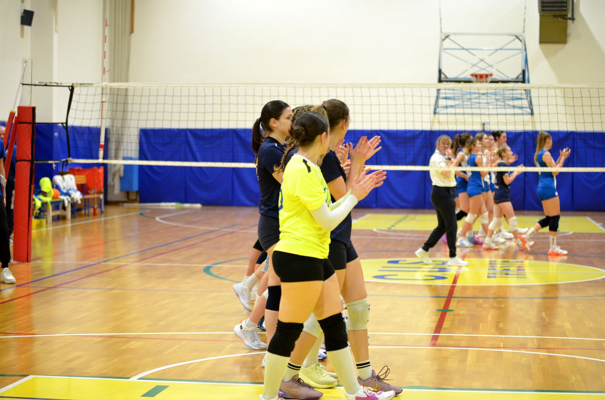 Un primo set molto equilibrato vede le squadre andare avanti punto a punto fino al 7 – 7. Il primo allungo delle universitarie, grazie ad una serie di muri della Capitana Irene Mullig, avviene sul 10 – 7. Le cussine mantengono il vantaggio fino al 16 – 12 quando, grazie ad una serie di servizi vincenti di Annalisa Sabbadini, allungano successivamente sul 23 – 14 per poi chiudere la pratica per 25 – 16.