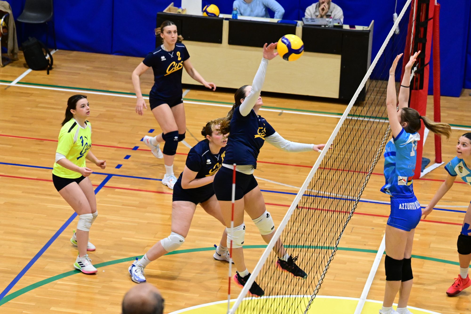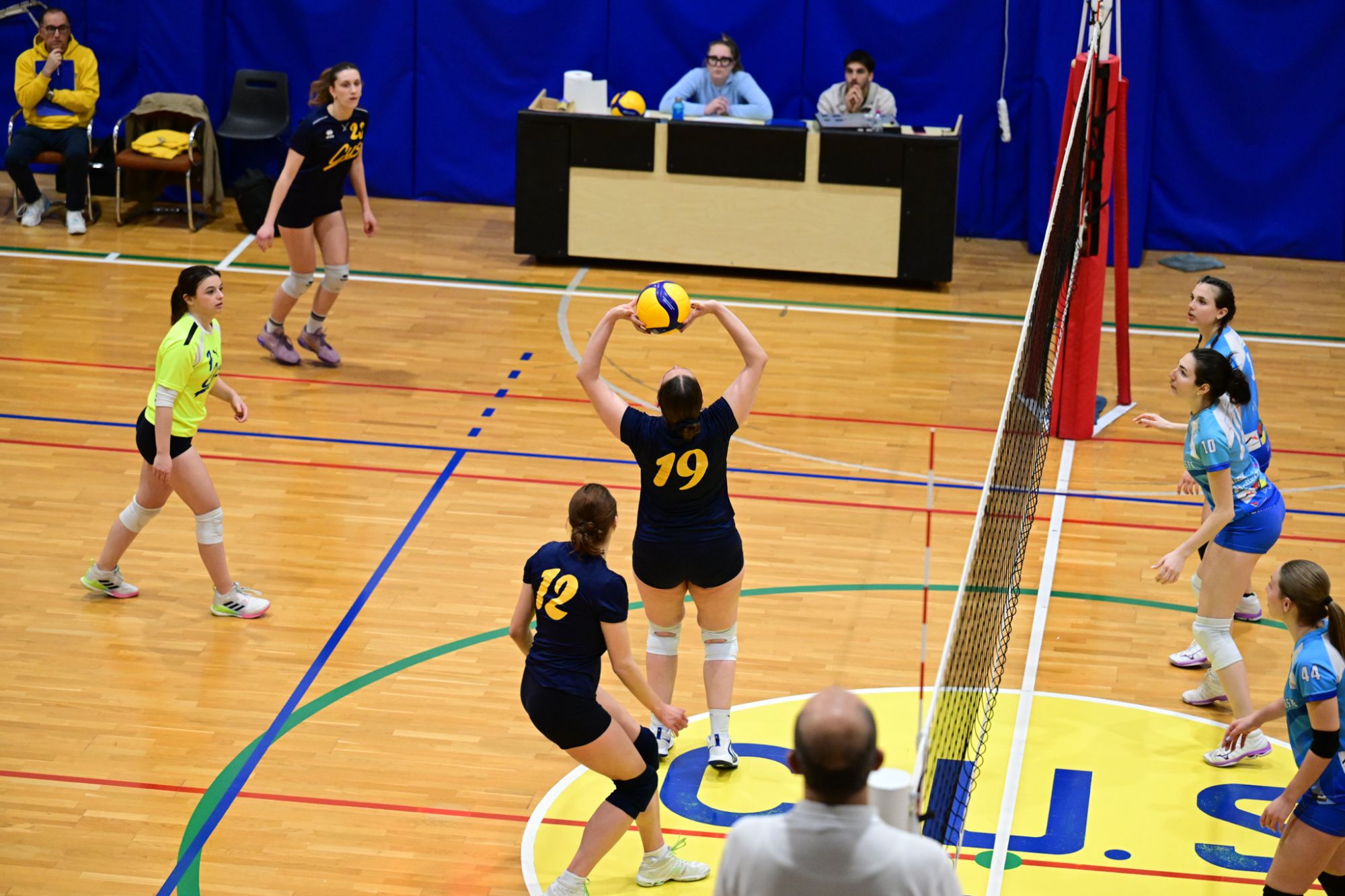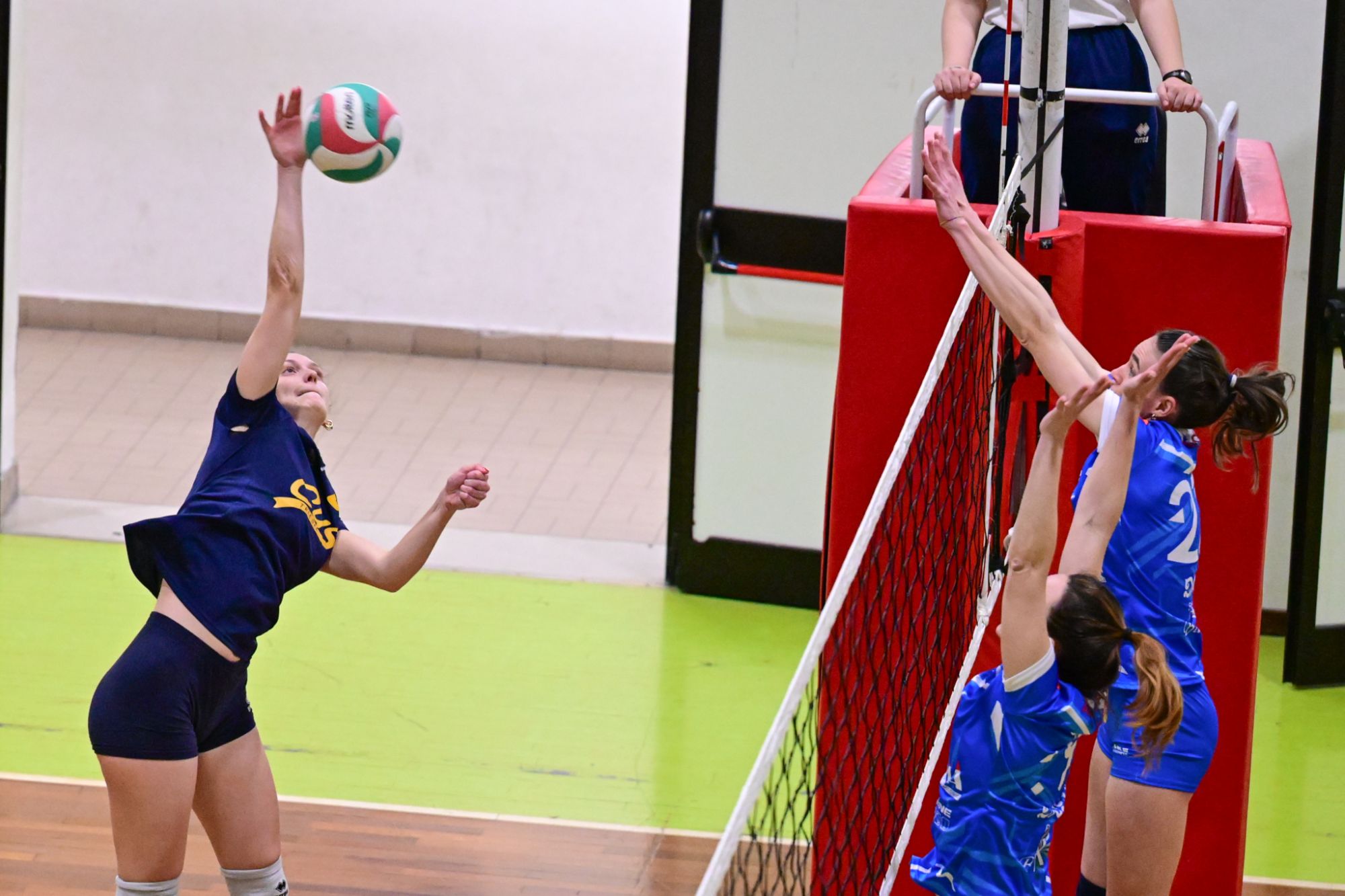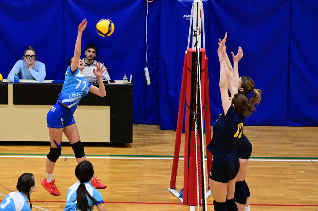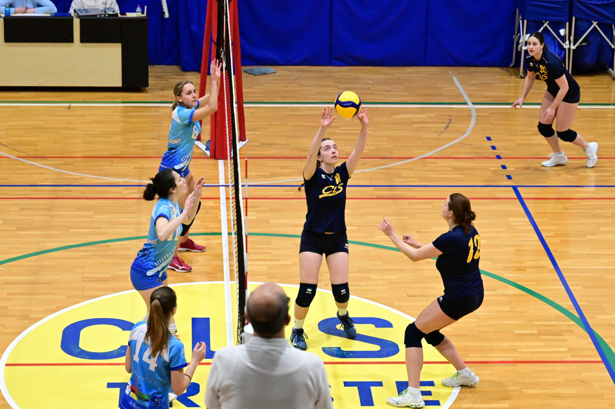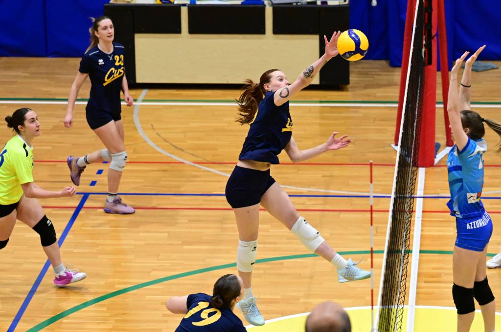 La prima parte della partita vede le squadre andare avanti punto a punto. Dopo il 3 – 3 iniziale, l’equilibrio continua fino all’ 8 – 8. Le ospiti effettuano il sorpasso ma la risposta cussina è immediata: le universitarie salgono sul 14 – 11. Le cussine mantengono i tre punti di vantaggio fino al 19 – 16. L’Azzurra risponde subito e addirittura la ribalta sul 20 – 21. Coach Vivona fa entrare Anna Zanardi al posto di Irene Mullig e le universitarie pareggiano subito con un ottimo attacco di Silvia Cestaro e poi, grazie alle battute di Chiara De Vidovich chiudono il primo set, a proprio favore, sul punteggio di 25 – 21.