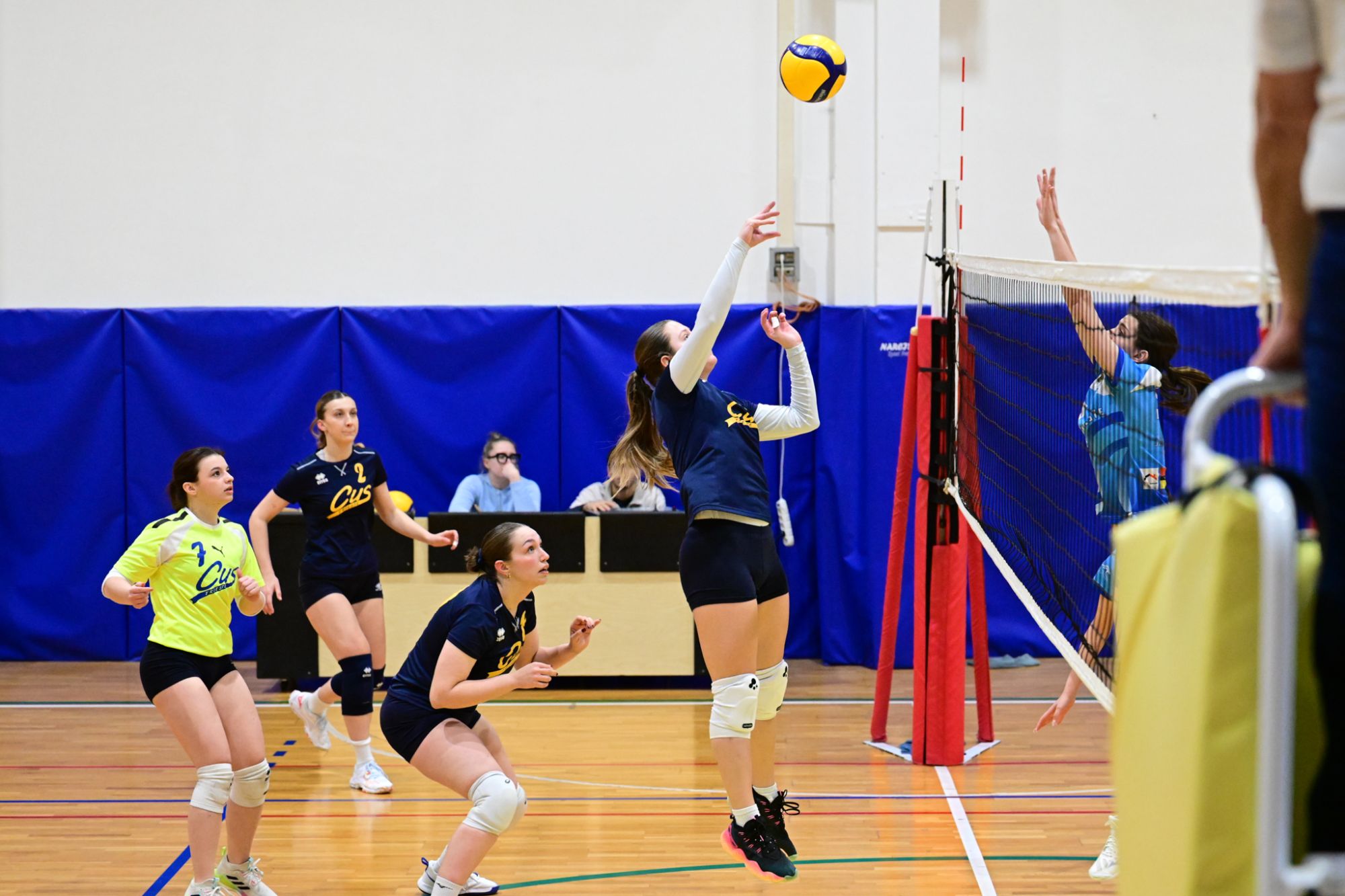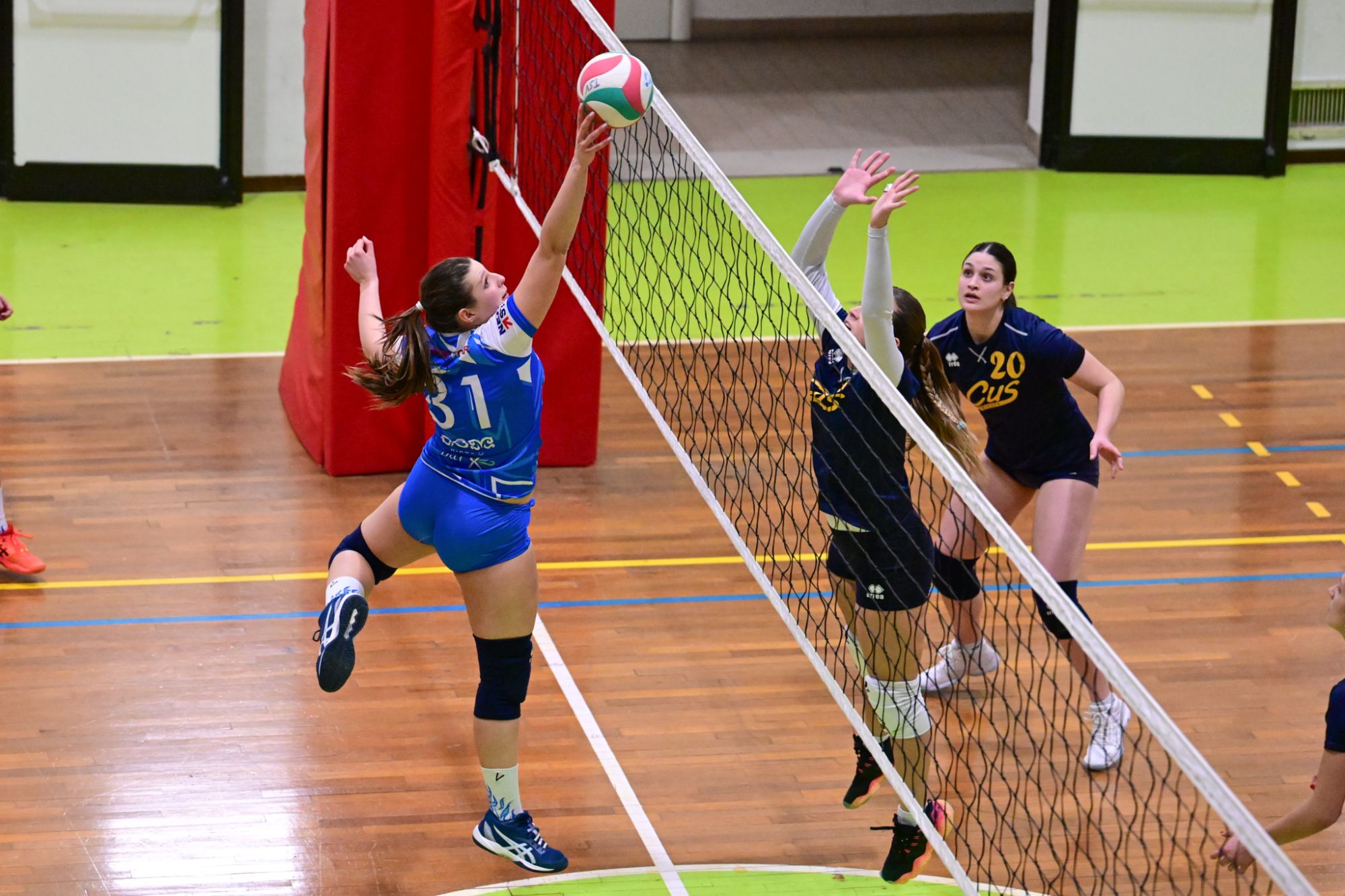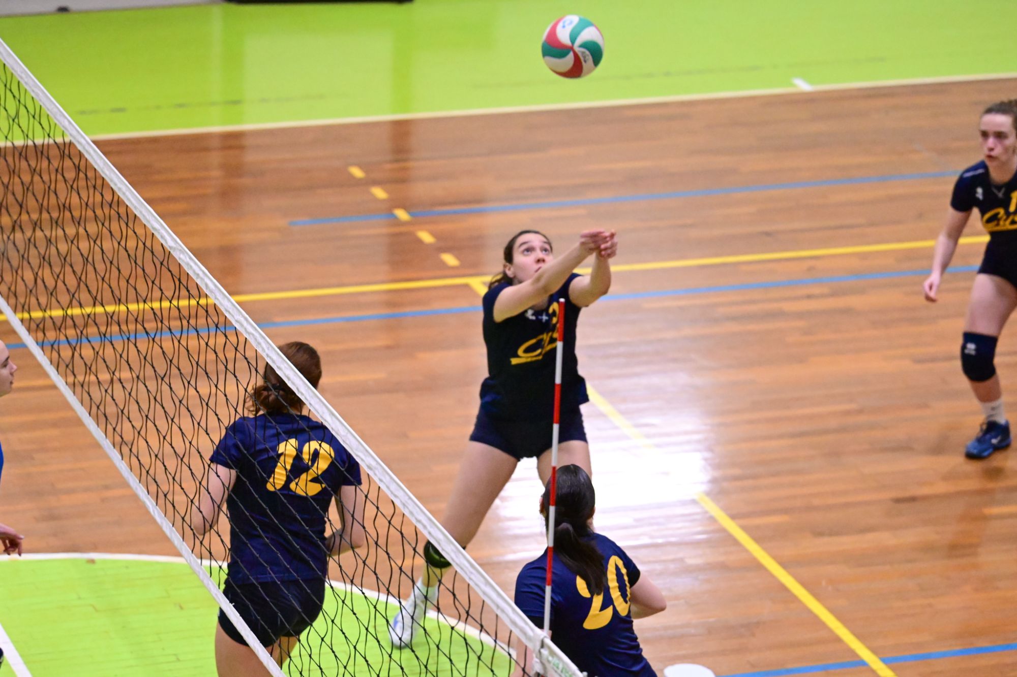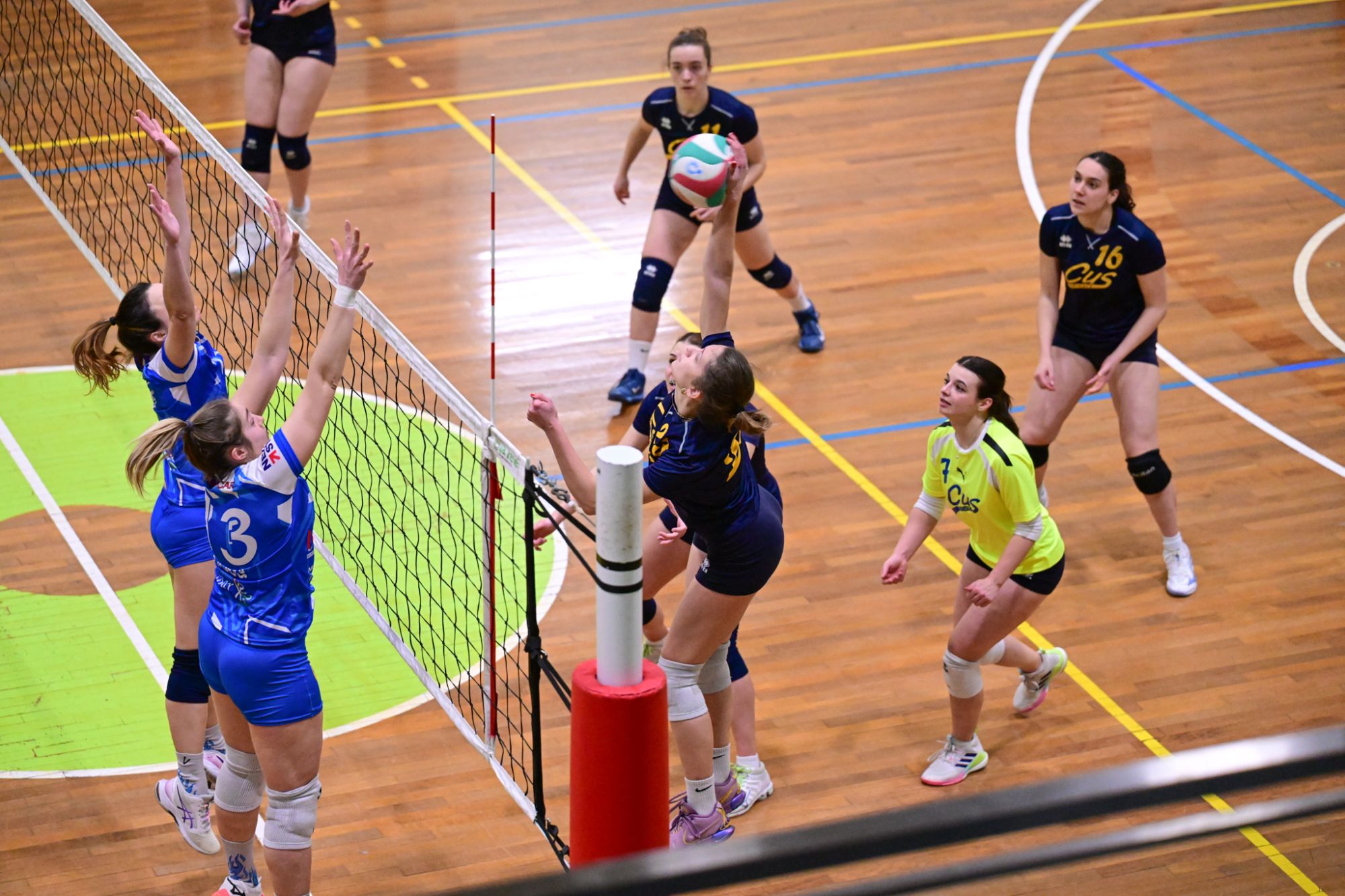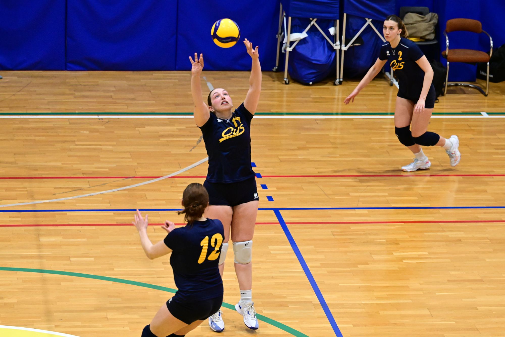 La prima parte della partita vede le squadre andare avanti punto a punto. Dopo il 3 – 3 iniziale, l’equilibrio continua fino all’ 8 – 8. Le ospiti effettuano il sorpasso ma la risposta cussina è immediata: le universitarie salgono sul 14 – 11. Le cussine mantengono i tre punti di vantaggio fino al 19 – 16. L’Azzurra risponde subito e addirittura la ribalta sul 20 – 21. Coach Vivona fa entrare Anna Zanardi al posto di Irene Mullig e le universitarie pareggiano subito con un ottimo attacco di Silvia Cestaro e poi, grazie alle battute di Chiara De Vidovich chiudono il primo set, a proprio favore, sul punteggio di 25 – 21.