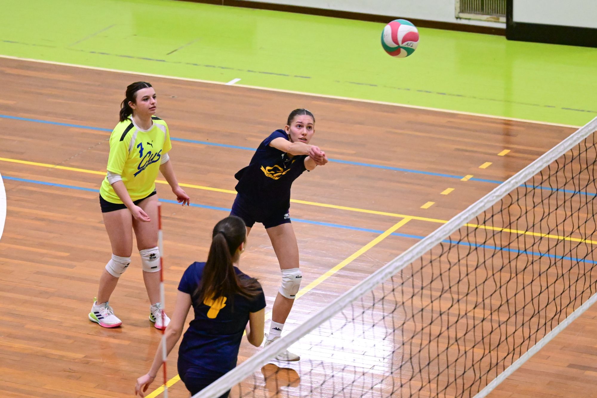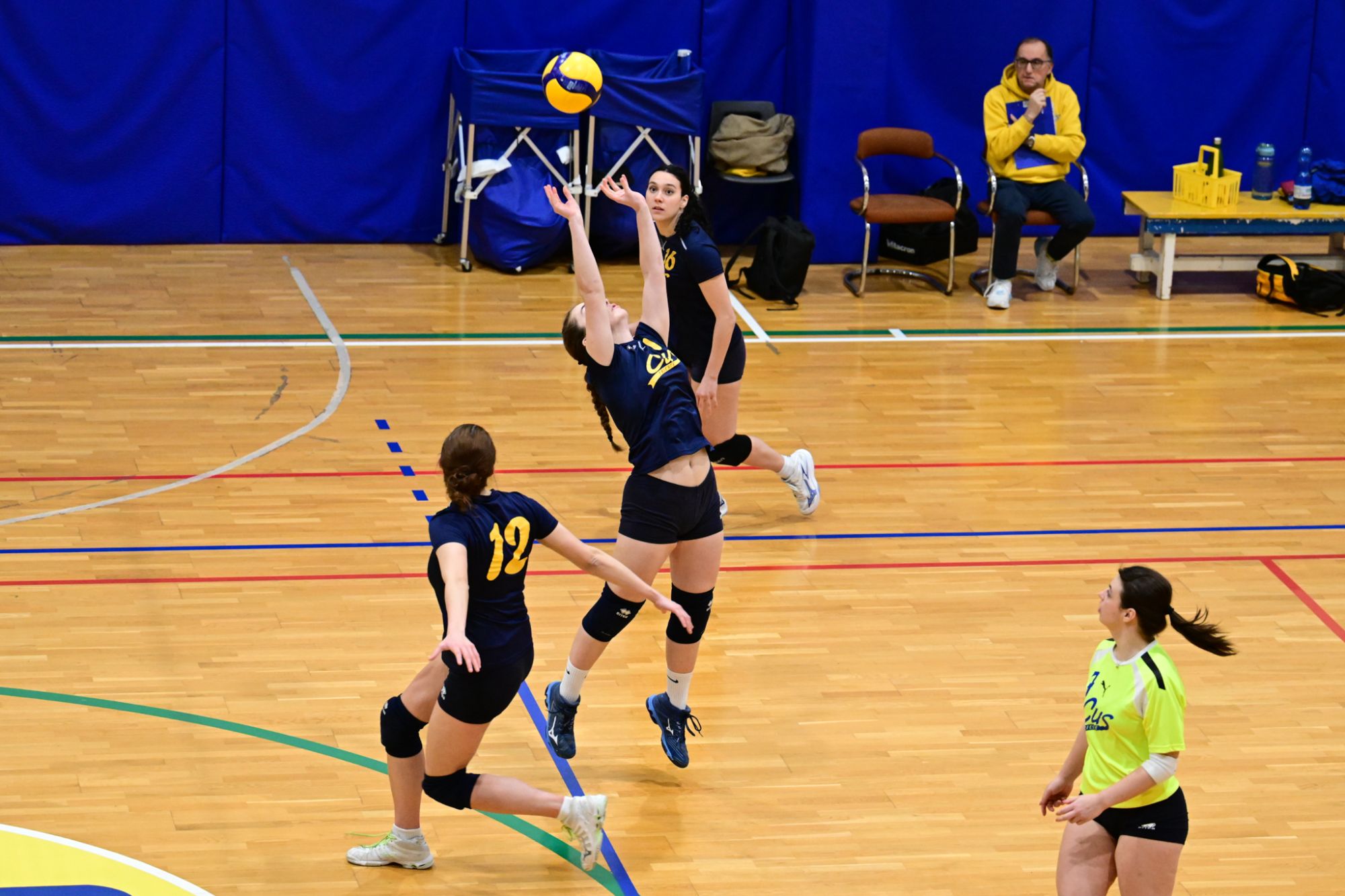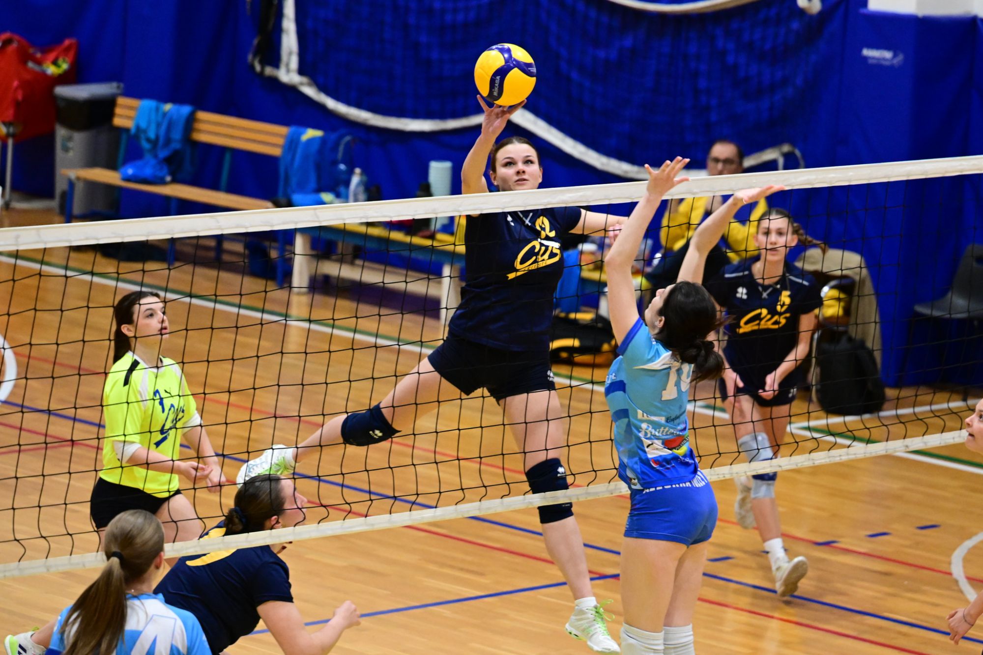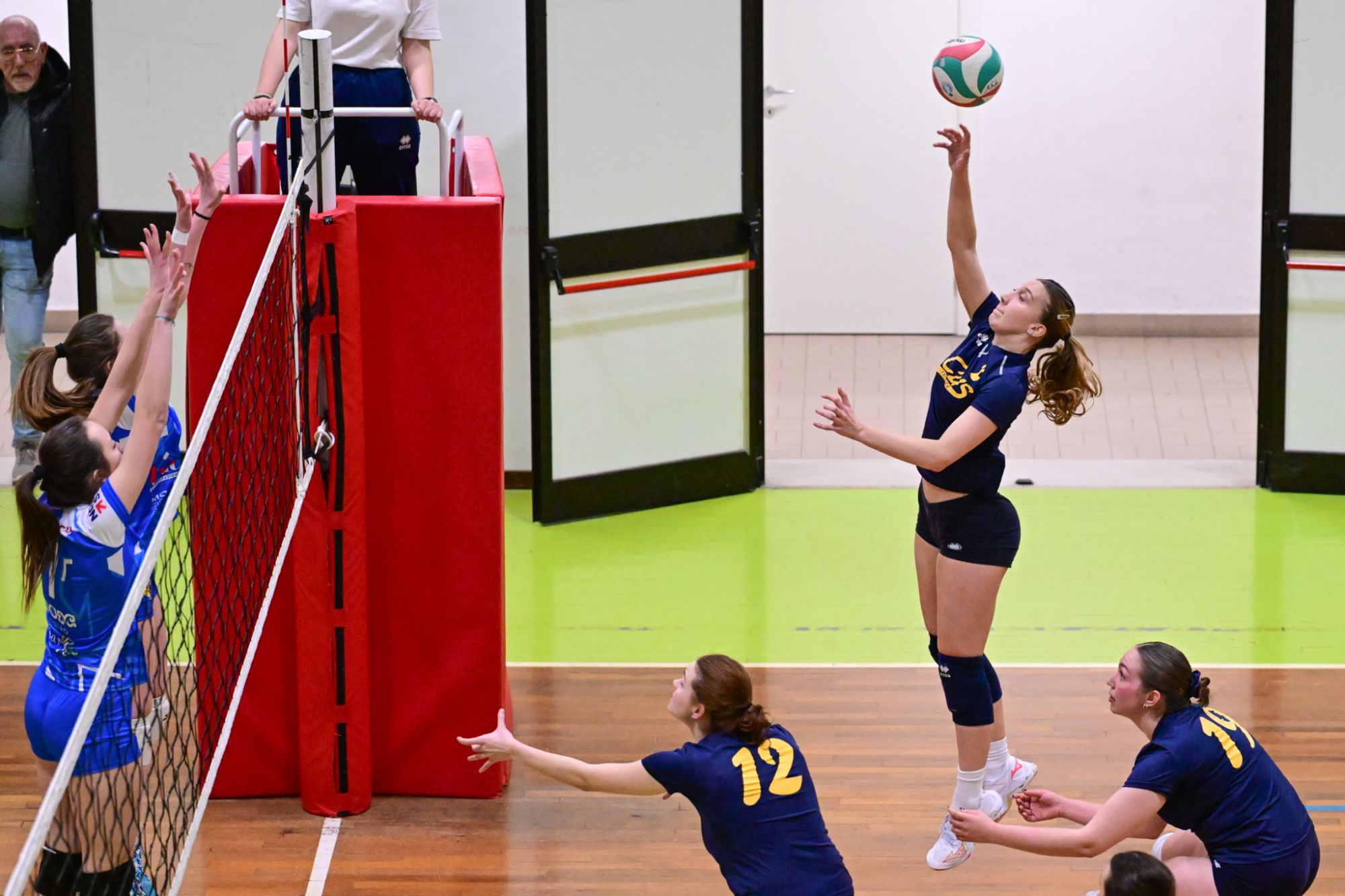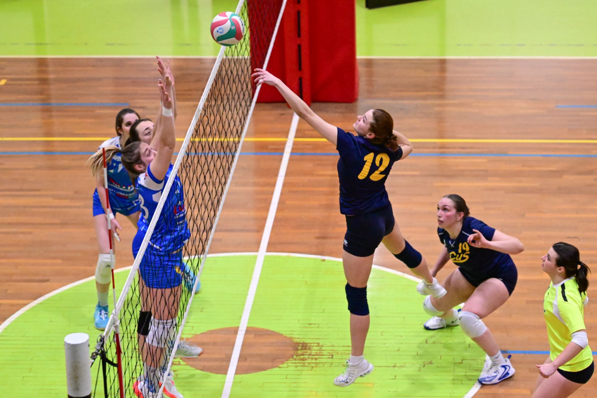 La prima parte della partita vede le squadre andare avanti punto a punto. Dopo il 3 – 3 iniziale, l’equilibrio continua fino all’ 8 – 8. Le ospiti effettuano il sorpasso ma la risposta cussina è immediata: le universitarie salgono sul 14 – 11. Le cussine mantengono i tre punti di vantaggio fino al 19 – 16. L’Azzurra risponde subito e addirittura la ribalta sul 20 – 21. Coach Vivona fa entrare Anna Zanardi al posto di Irene Mullig e le universitarie pareggiano subito con un ottimo attacco di Silvia Cestaro e poi, grazie alle battute di Chiara De Vidovich chiudono il primo set, a proprio favore, sul punteggio di 25 – 21.