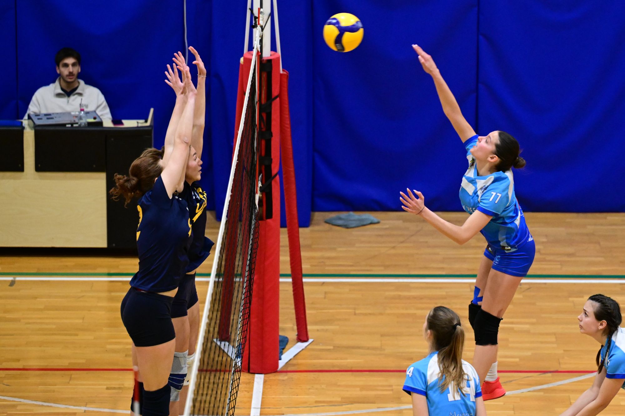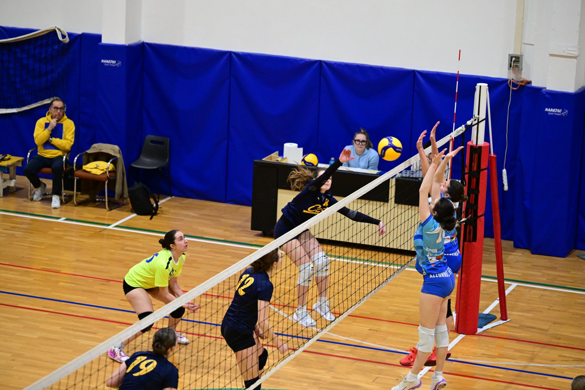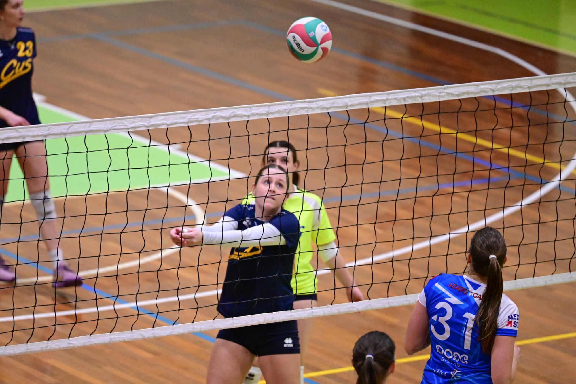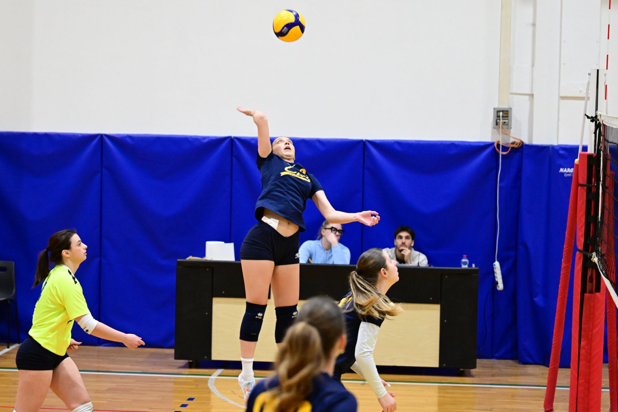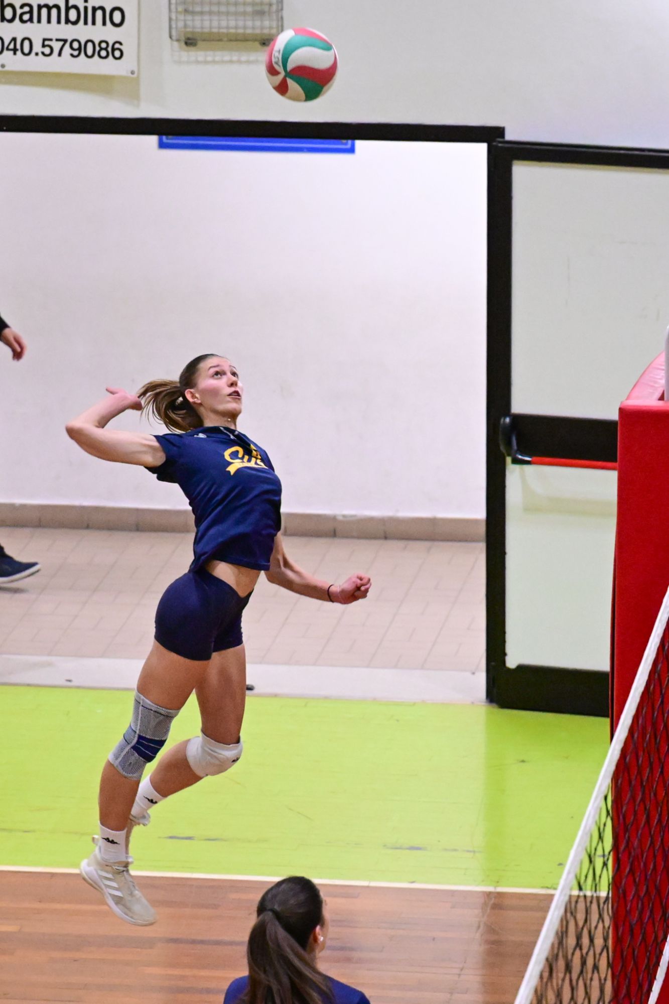 La prima parte della partita vede le squadre andare avanti punto a punto. Dopo il 3 – 3 iniziale, l’equilibrio continua fino all’ 8 – 8. Le ospiti effettuano il sorpasso ma la risposta cussina è immediata: le universitarie salgono sul 14 – 11. Le cussine mantengono i tre punti di vantaggio fino al 19 – 16. L’Azzurra risponde subito e addirittura la ribalta sul 20 – 21. Coach Vivona fa entrare Anna Zanardi al posto di Irene Mullig e le universitarie pareggiano subito con un ottimo attacco di Silvia Cestaro e poi, grazie alle battute di Chiara De Vidovich chiudono il primo set, a proprio favore, sul punteggio di 25 – 21.