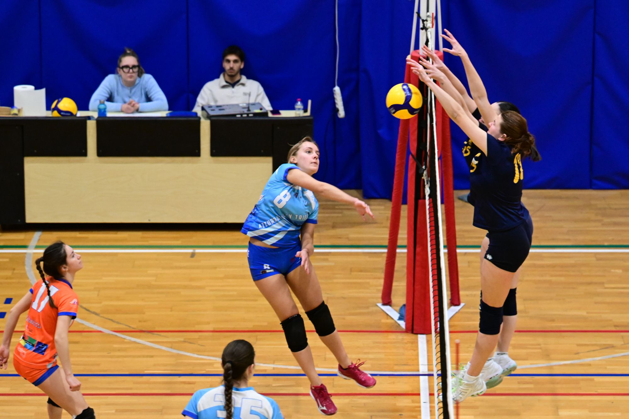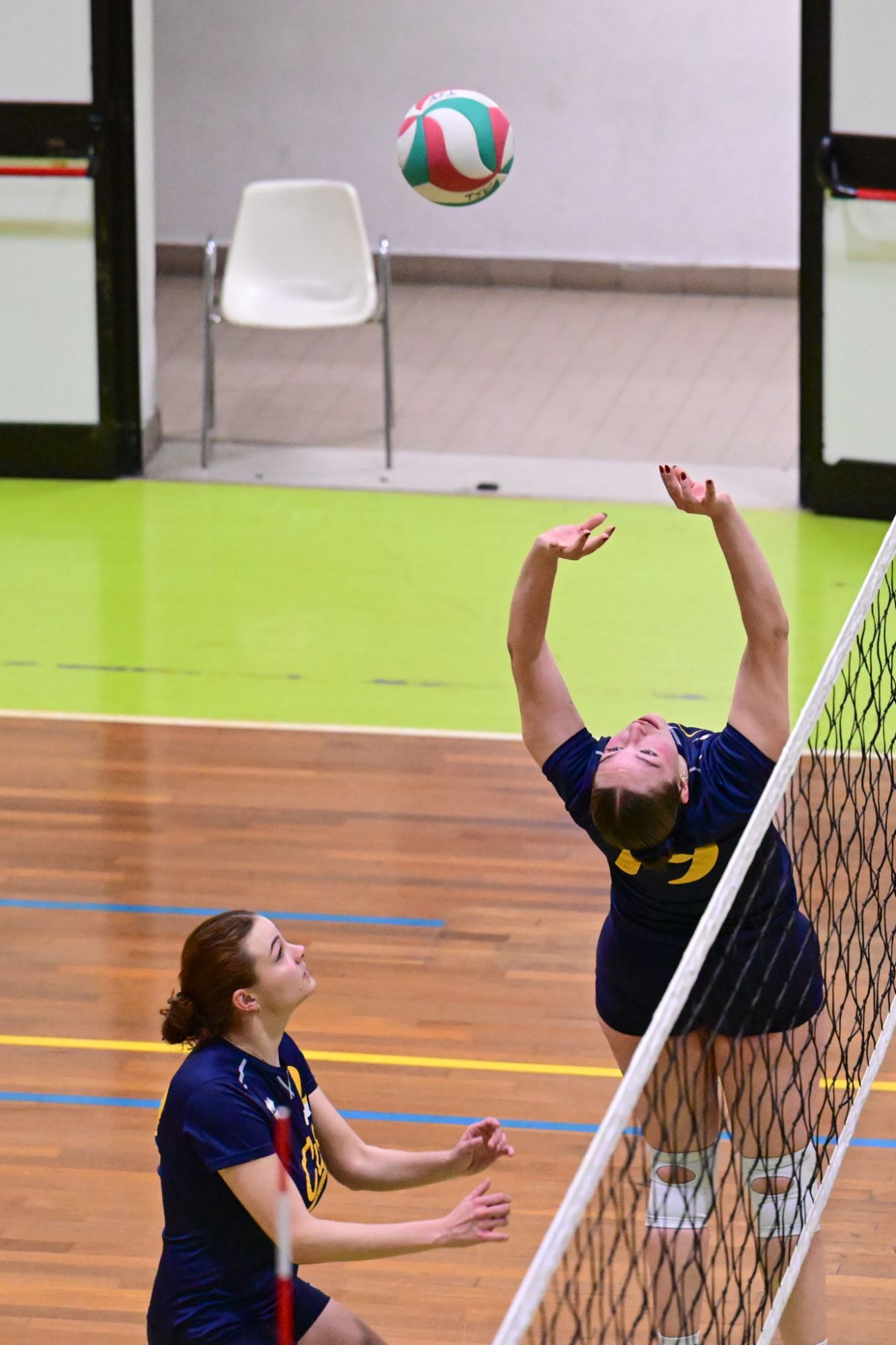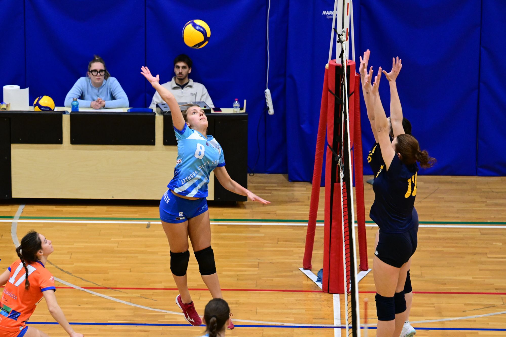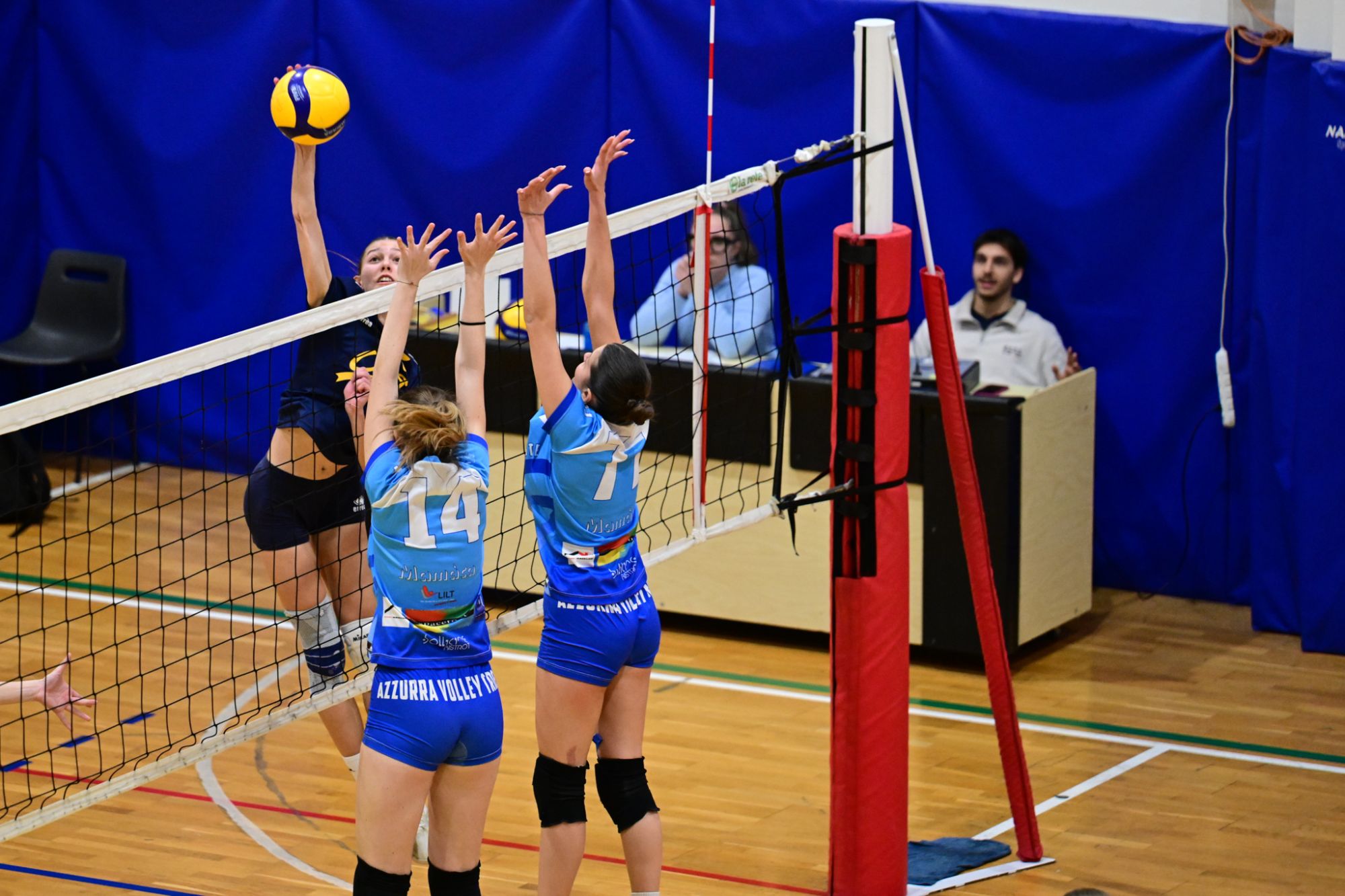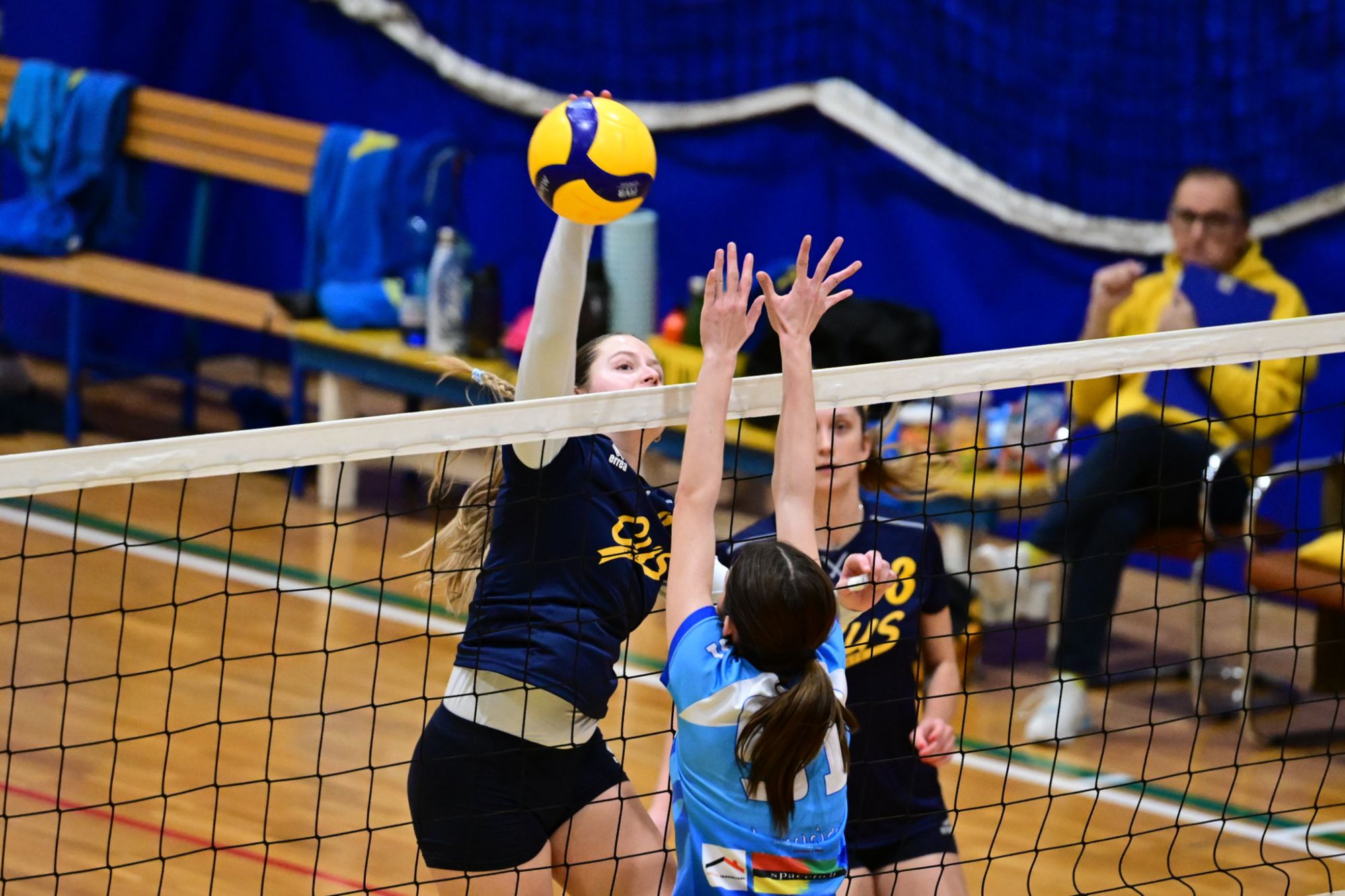 La prima parte della partita vede le squadre andare avanti punto a punto. Dopo il 3 – 3 iniziale, l’equilibrio continua fino all’ 8 – 8. Le ospiti effettuano il sorpasso ma la risposta cussina è immediata: le universitarie salgono sul 14 – 11. Le cussine mantengono i tre punti di vantaggio fino al 19 – 16. L’Azzurra risponde subito e addirittura la ribalta sul 20 – 21. Coach Vivona fa entrare Anna Zanardi al posto di Irene Mullig e le universitarie pareggiano subito con un ottimo attacco di Silvia Cestaro e poi, grazie alle battute di Chiara De Vidovich chiudono il primo set, a proprio favore, sul punteggio di 25 – 21.