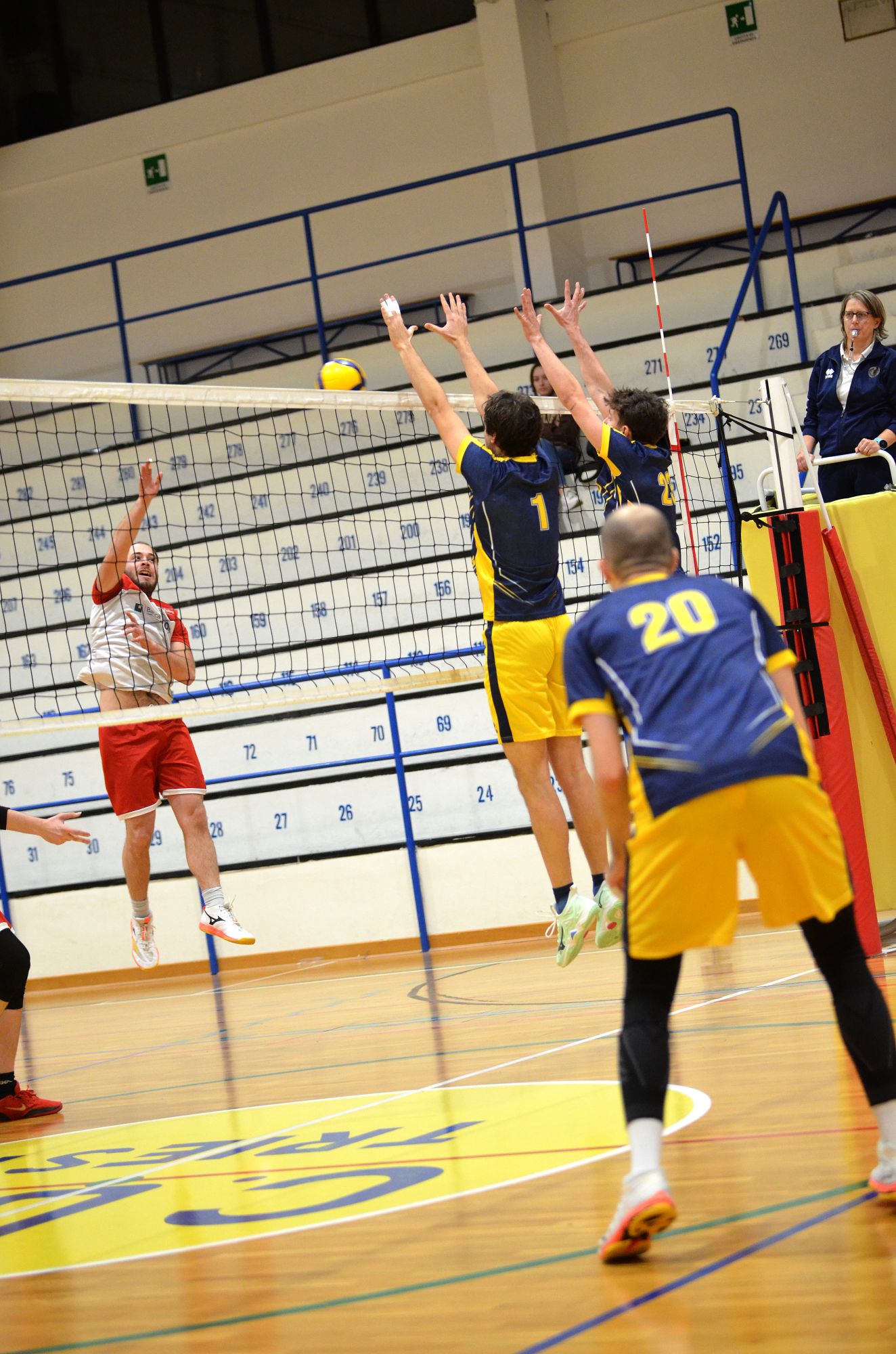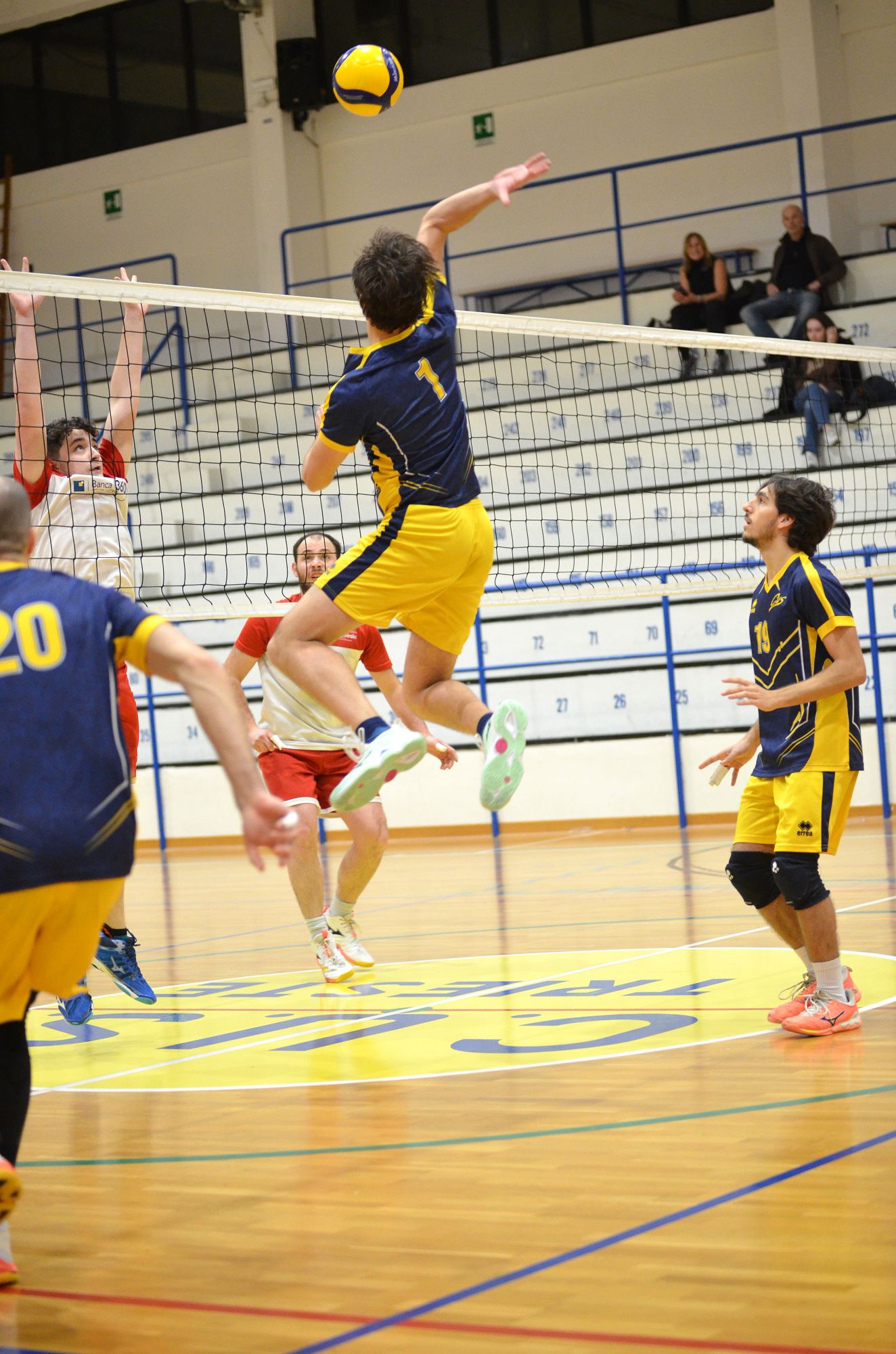 Nella quinta giornata di ritorno del campionato Regionale di serie D maschile, gli universitari ospitano l’A.P. Travesio. La partita non inizia bene per i padroni di casa con tre errori consecutivi in attacco (0-3) ma poi i triestini reagiscono e impattano sull’ 8–8. C’è però un nuovo allungo per gli ospiti che si portano sul 9–11 costringendo il coach seppi al suo primo time out. Al ritorno in campo gli universitari reagiscono immediatamente portandosi sul 13–13 con un muro punto di Elia Millo (autore di ben quattro muri punto nel primo set). Con Luca Salice in battuta i cussini scappano via fino al 20-13. A.P. Travesio tenta il recupero ma è troppo tardi e gli universitari chiudono in gestione il primo set sul 25–21.