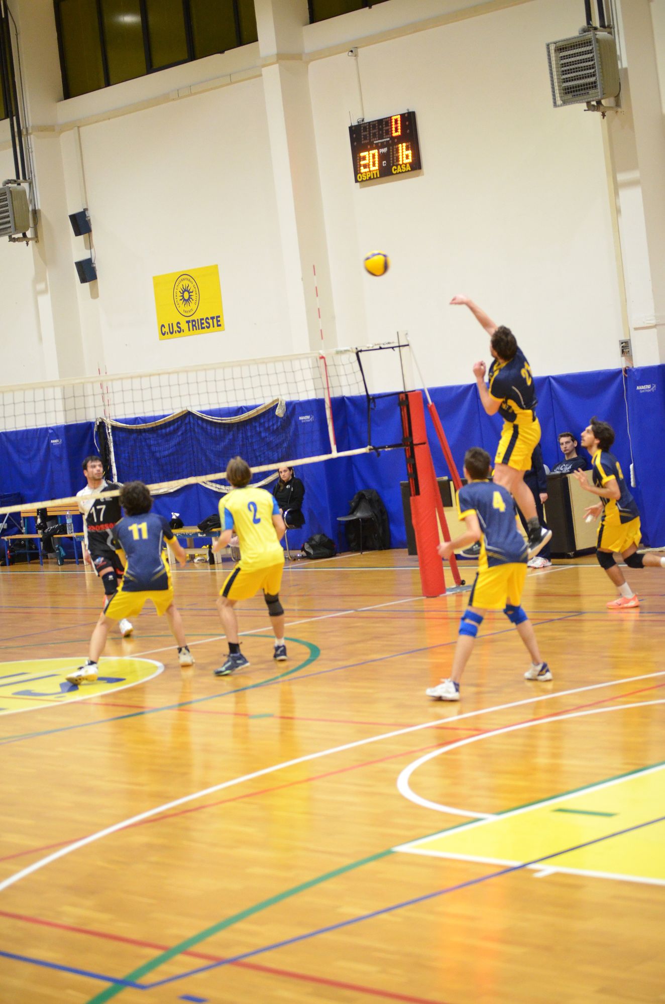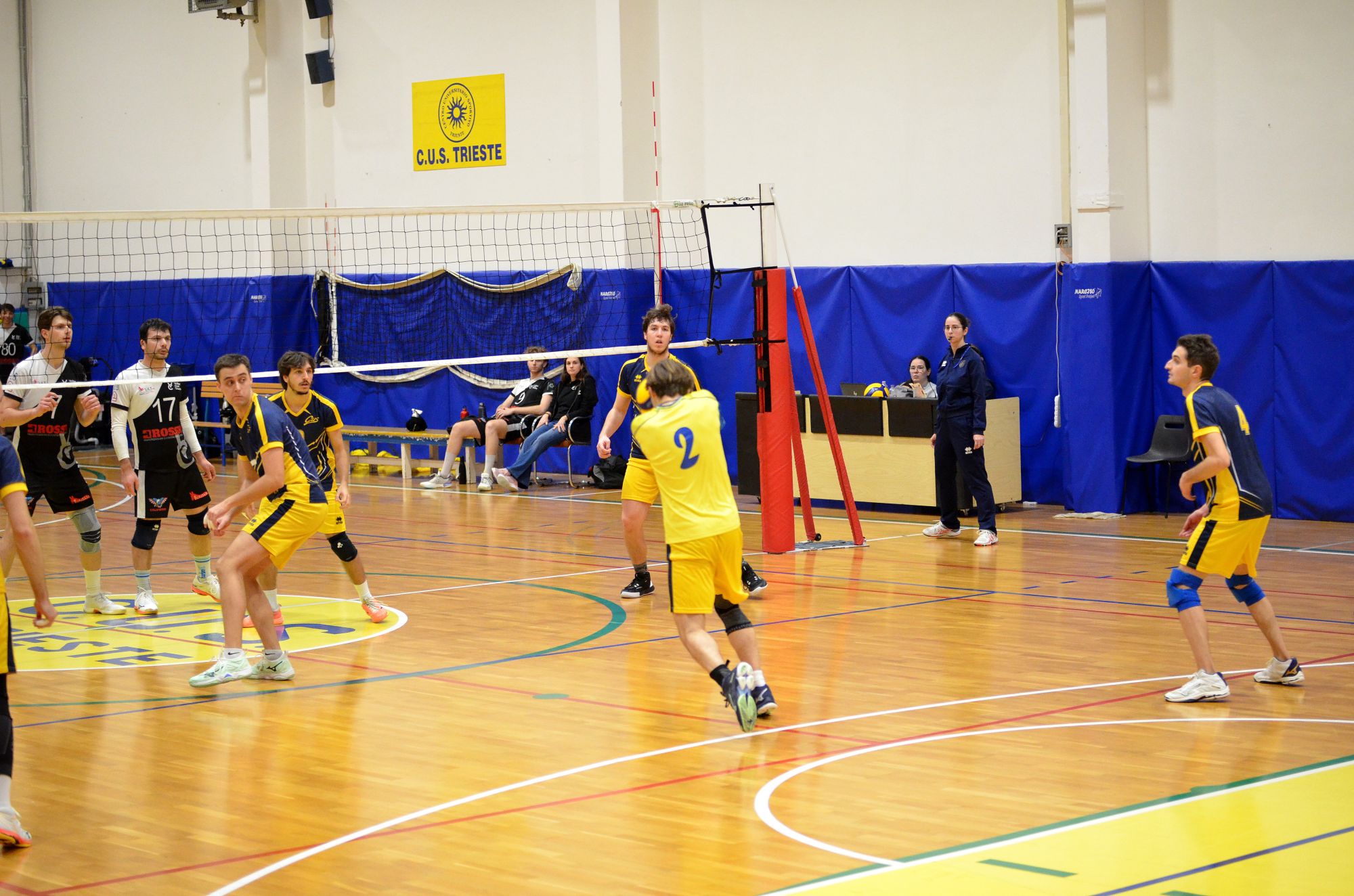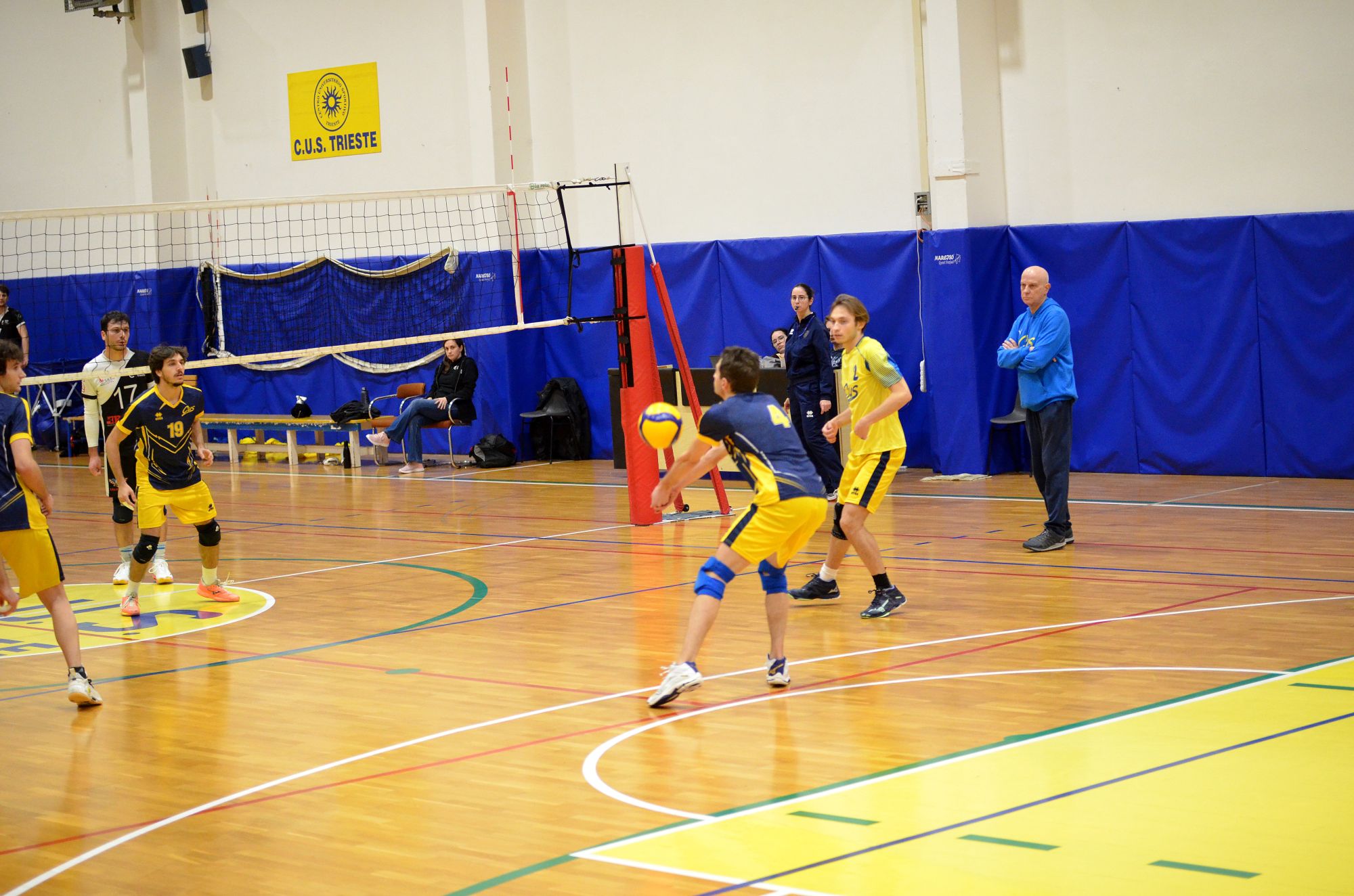 Coach Seppi parte con Gianmaria Palma in palleggio, Marco Sfregola in opposto, Elia Millo e Tommaso Piscitelli in banda, Capitano Filipp Dassoni e Massimo Di Cosimo in centro e con Gabriele Kragel come libero al posto dell’assente Luca Schiroli. L’inizio molle degli universitari, che commettono tanti errori in attacco, e permettono agli ospiti di scappare sul 6-2. Al ritorno in campo non cambia la musica e il Volley club va in fuga. Sul punteggio di 5–14 il CUS Trieste fa entrare Pietro Mihalj al posto di Marco Sfregola e Luca Salice Al posto di Tommaso Piscitelli. Le cose migliorano leggermente ma è troppo tardi e gli ospiti non hanno alcun problema per chiudere il primo set sul punteggio di 13–25.